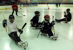 Sledge Hockey is a variant of ice hockey and can be played on and off ice, using sledges to allow participants to move about the rink at high speeds hitting a puck travelling at speeds of up to 100kph. Players sit in adapted sledges, propelling themselves with sticks adapted to allow propulsion in a manner similar to skiing. As players are strapped to a sledge everybody has the same restrictions, regardless of whether or not the player has a disability.